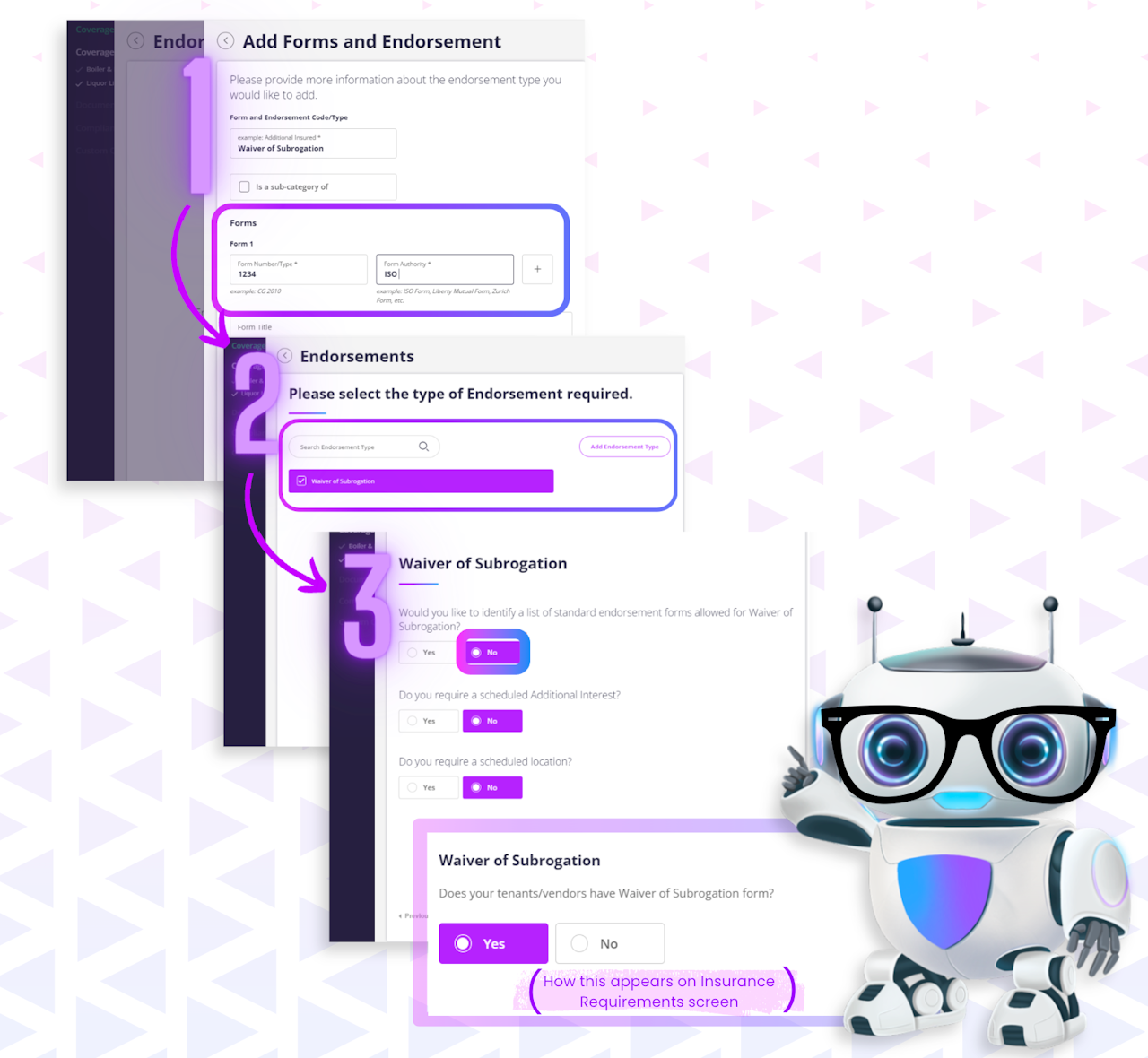 Add a form as 'Waiver of Subrogration', enter a random form number (example: 1234), then add 'Form Authority' (example: ISO), then click 'Submit' to see the endorsement list.