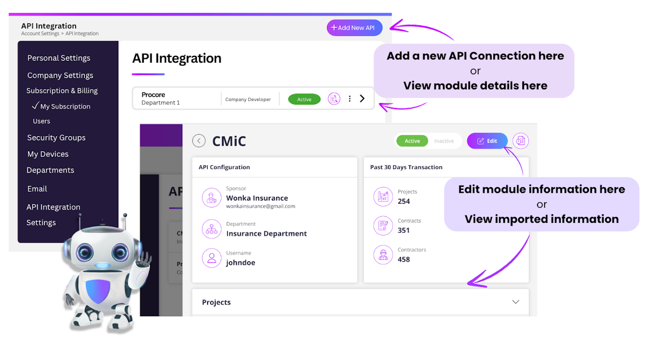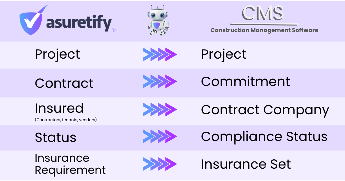 API integration in simple terms, is connecting, or linking, your accounts on 2 different systems so they can share information with each other to simplify compliance tracking and management tasks. For example, you can import contract and coverage details into Asuretify and export compliance statuses to the connected account. It's kinda like when a superhero has a sidekick-they become the dynamic duo that work together to save the day.