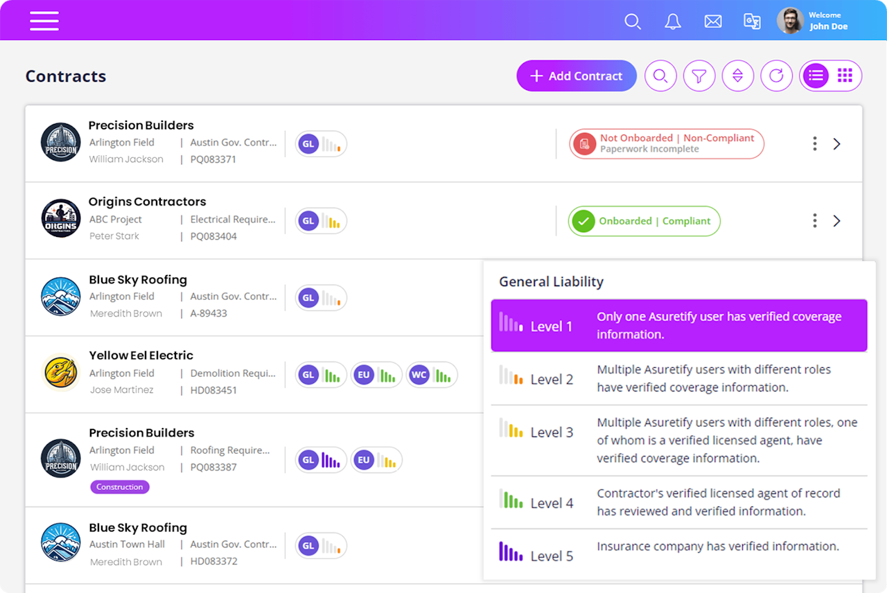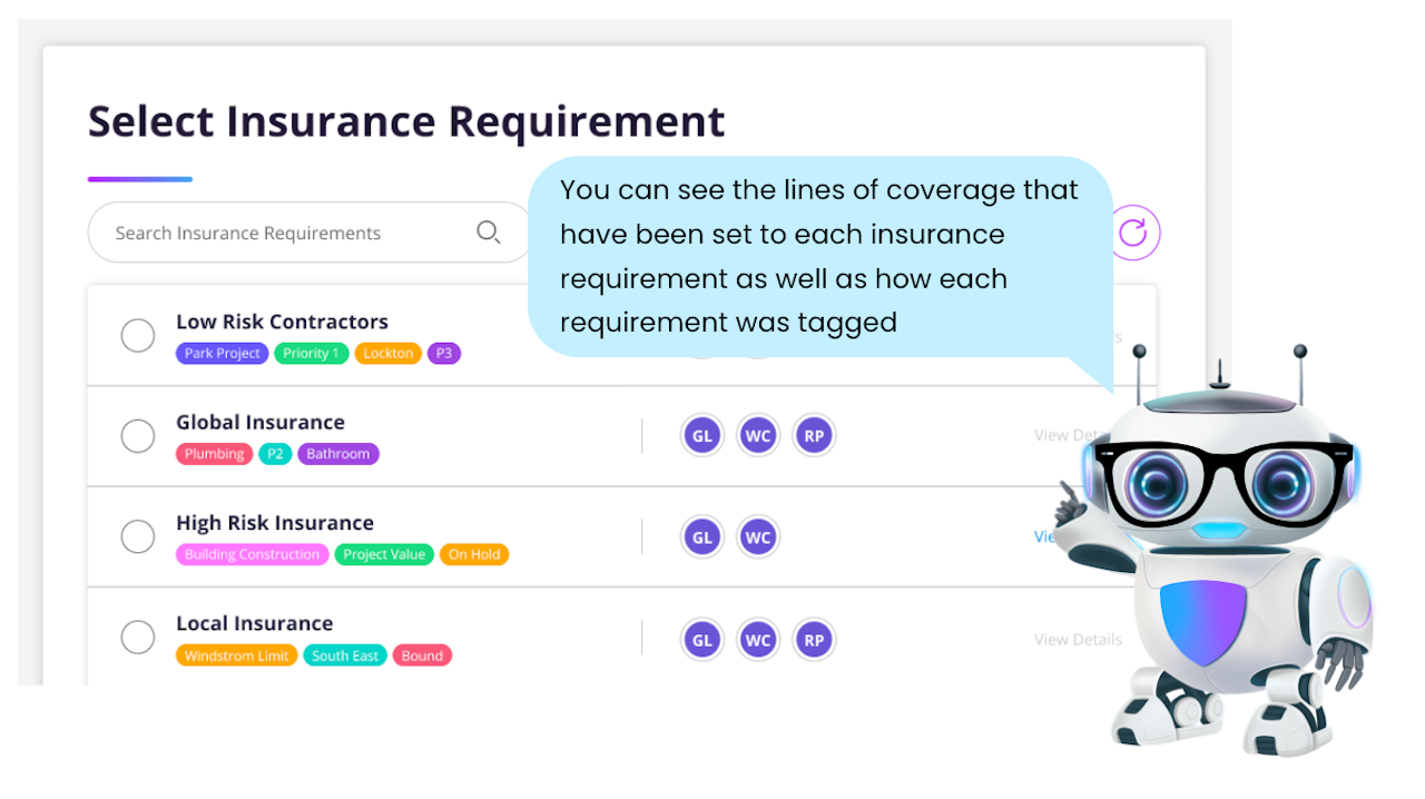 Add an insurance requirement in Asuretify to link the projects and contracts imported from your other integrated system. This added layer of organization helps you see the coverage of your projects and contracts.