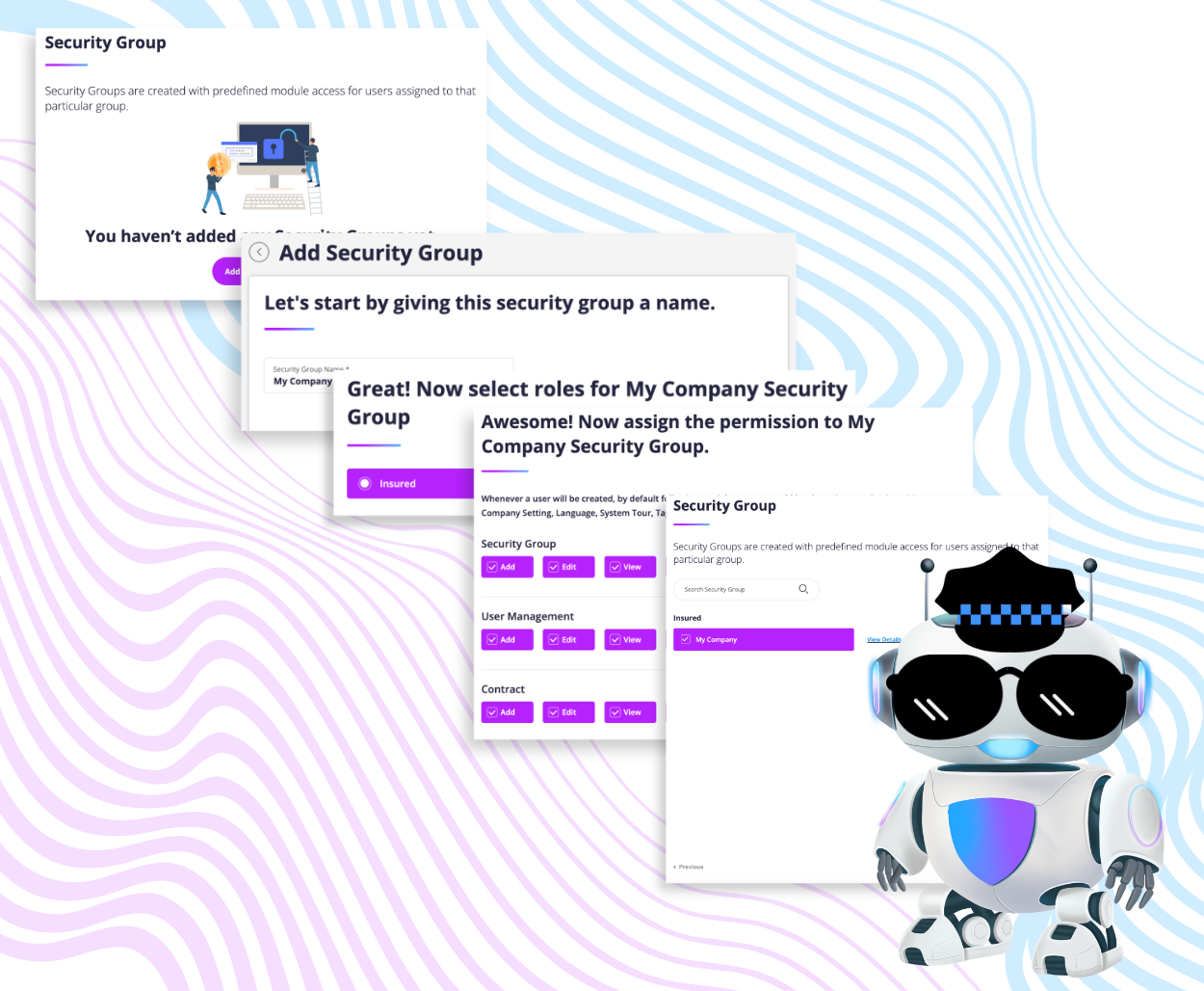 Selecting the security group settings is next. This is setting the permissions of what the added user can do in Asuretify. You can name the security group, select the role (insured, requestor, or agent), then assign the permissions for what they can do.