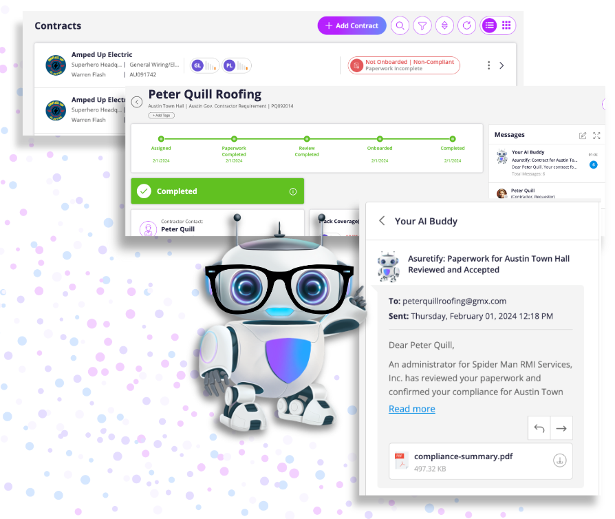 The Contracts screen displays the contracts, compliance status, and where you can create new contracts. When you make a new contract, an invitation is sent to the insured so they can upload their insurance documents, verify their details, and provide any other documents that may be required.