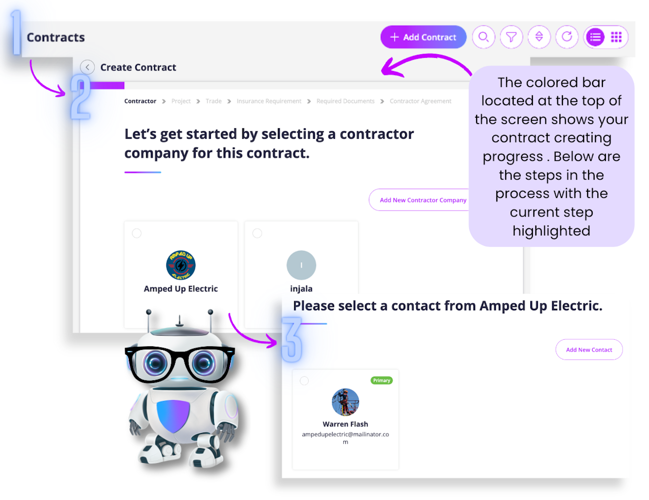 The first step is clicking 'Add Contract' to open the guided set-up process. Then, select a contractor or add a new contractor company if they have not previously been added to the Asuretify system. After, select the contact for that company. Again, if your desired contact is not listed, feel free to add them as a new contact.