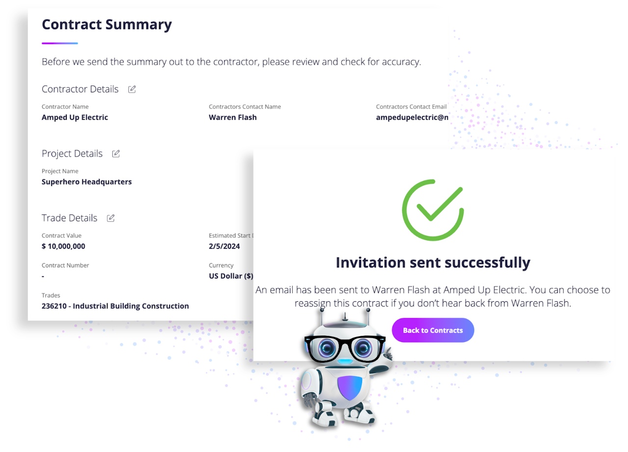 Great work! You're nearly finished! Once you verified the contract details are correct, you can click to invite the contractor to begin onboarding. They will receive an email notification containing a link to access Asuretify and provide their coverage documents for verification.