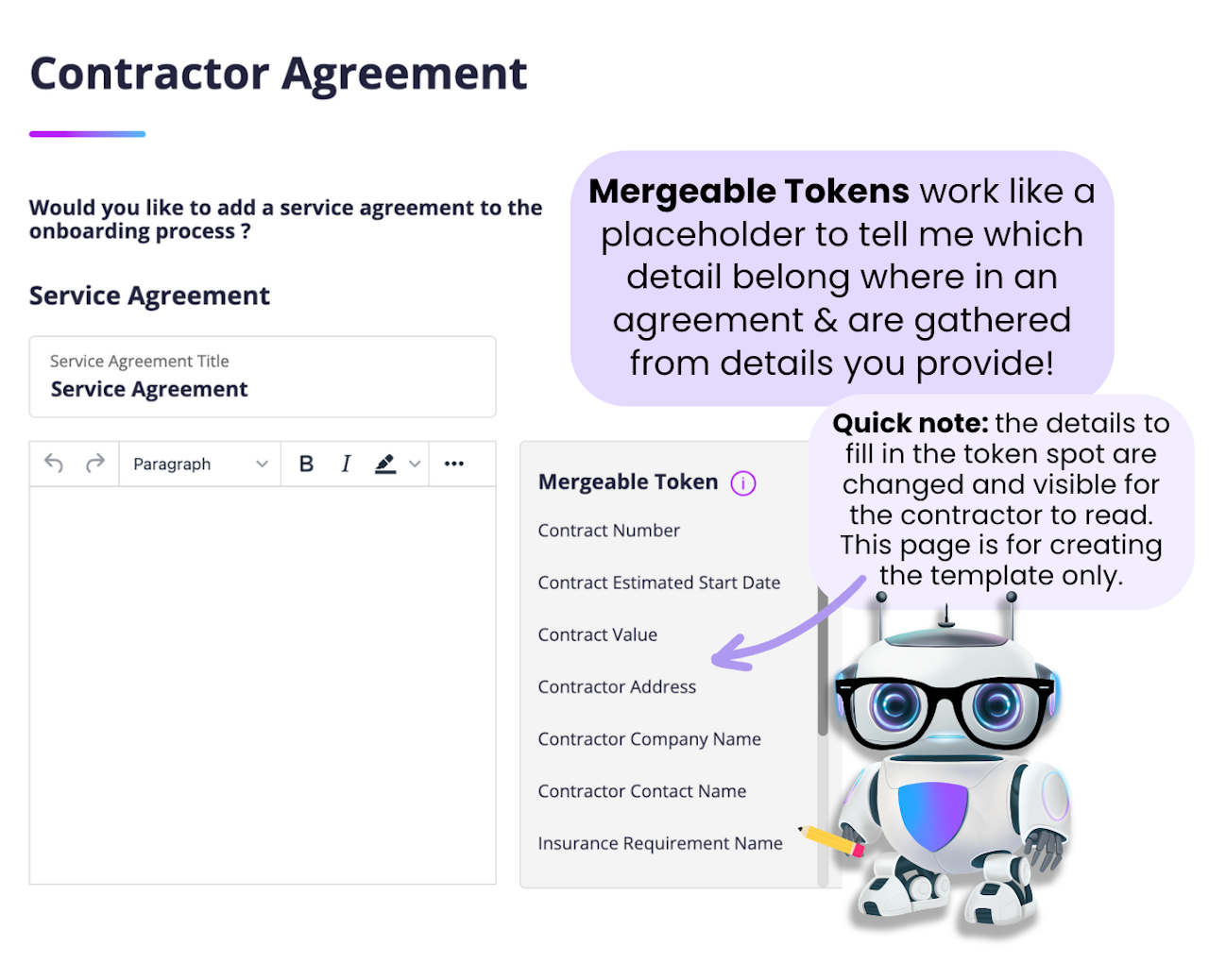 If you select to add an agreement, you will be directed to that step. Using Mergeable Tokens within the Asuretify system allows you to create agreement templates that can be personalized for each project, contractor, or contract. When using a token in the template, our system gathers the specific details to replace the place holder and the contractor is shown the completed message with the relevant details filled in where the token was used.
