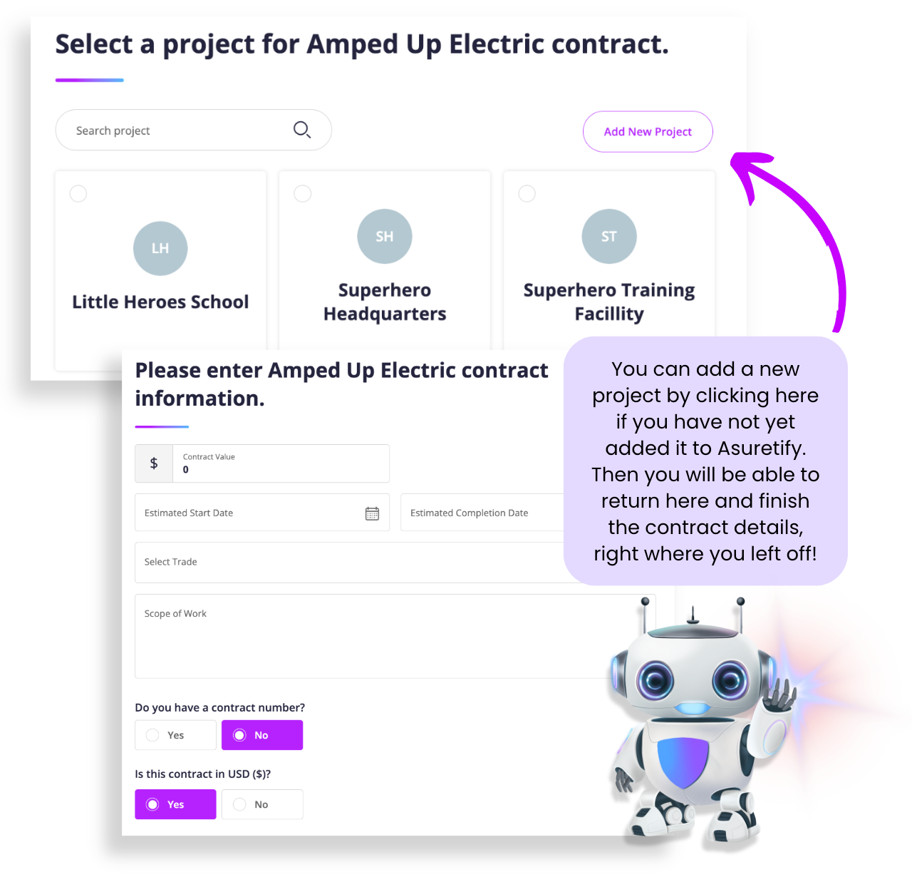 The next step is to assign the contractor to the project they are providing services for. If you have created the intended project in Asuretify, You should see that on screen and be able to assign the contractor.