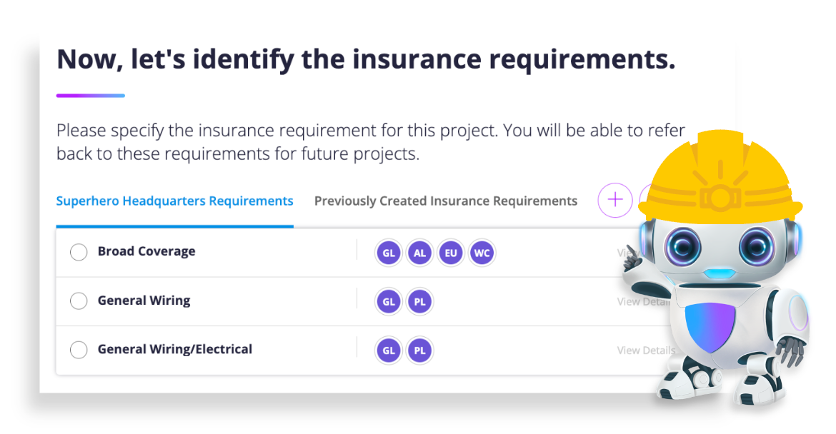 Now you will need to assign the insurance requirements for this project. We understand inputting insurance coverage can be tedious and leave room for error, so we have developed an area in our system to allow you to create sets of insurance requirements that are customizable to your needs and can be save to be used for other contracts.