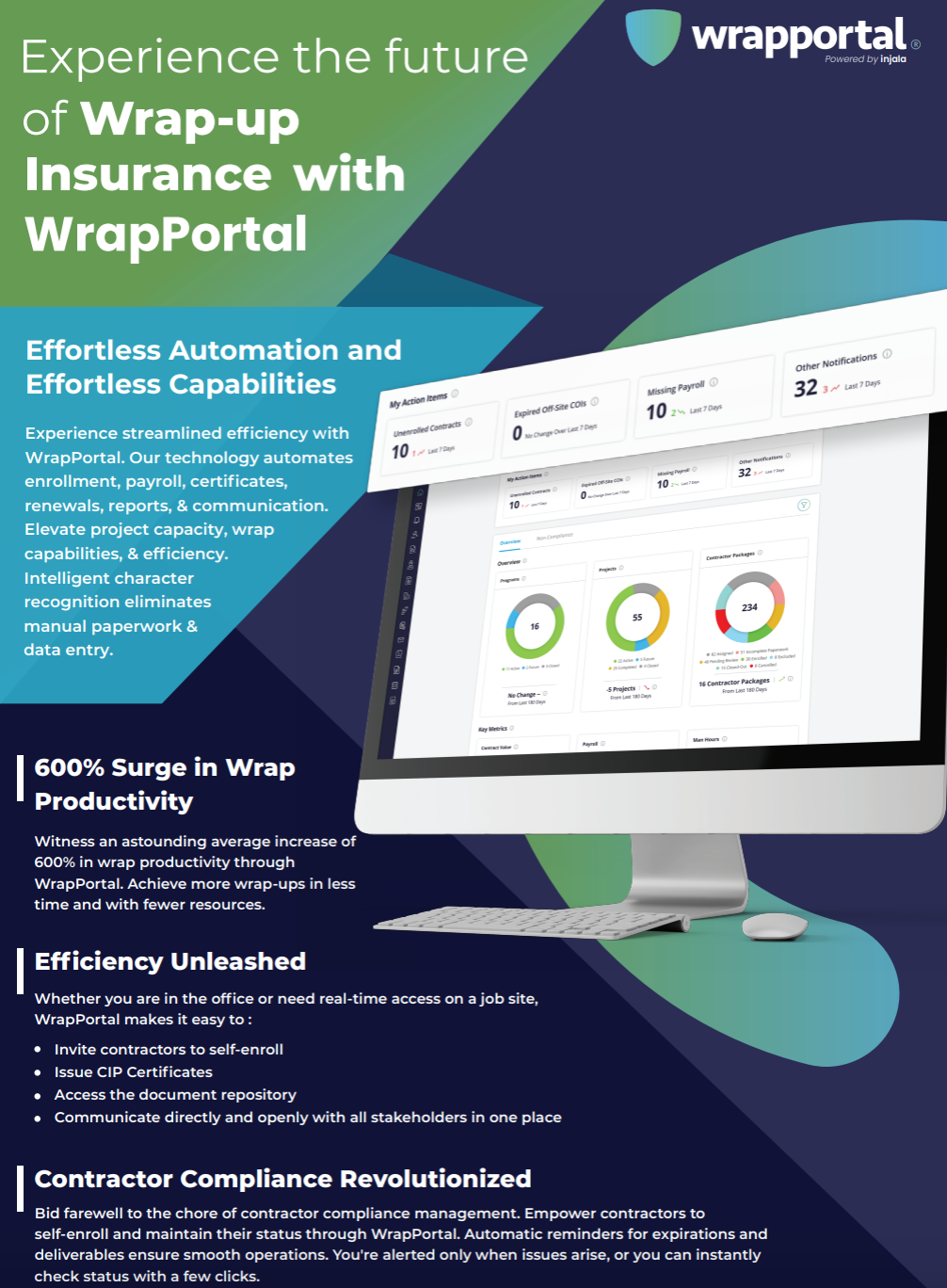 WrapPortal® is the complete, automated wrap-up solution that significantly increases your productivity while reducing costs. Plus WrapPortal is entirely customizable, secure, and scalable, with easy-to-use interfaces for administrators, contractors, carriers and executives. Perhaps most importantly, WrapPortal removes potential-limiting software obstacles so you can focus on maximizing your core business rather than trying to make one-size-fits-all-software work for your unique business. With WrapPortal wrap-up insurance software, you’ll be light-years ahead.