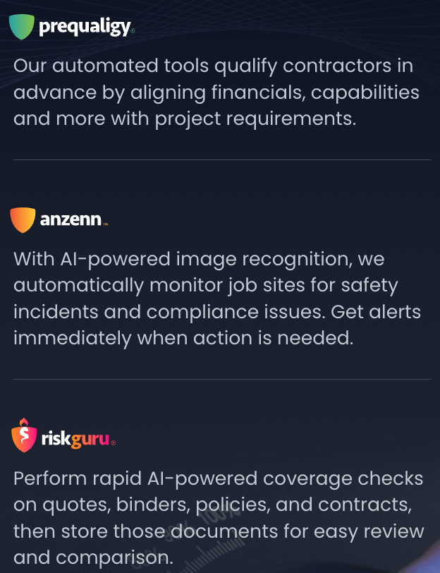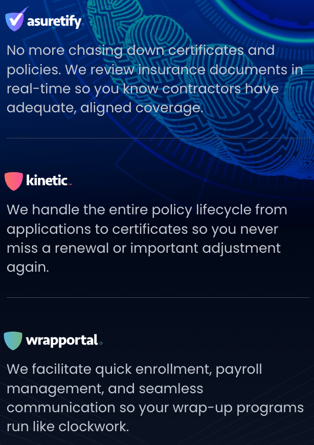 Our squad leverages the revolutionary Anzenn, Asuretify, Kinetic, Prequaligy, RiskGuru, and WrapPortal to lift routine yet critical work off your plate. We smoothly coordinate complex workflows so you enjoy blissful ignorance of the bureaucracy once bogging you down.