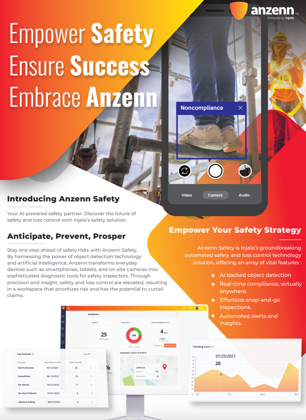 By employing object detection technology and artificial intelligence, Anzenn™ transforms smart phones, tablets and on-site cameras into powerful diagnostic tools for safety inspectors to improve safety and loss control, resulting in a safer workspace and potentially fewer claims.