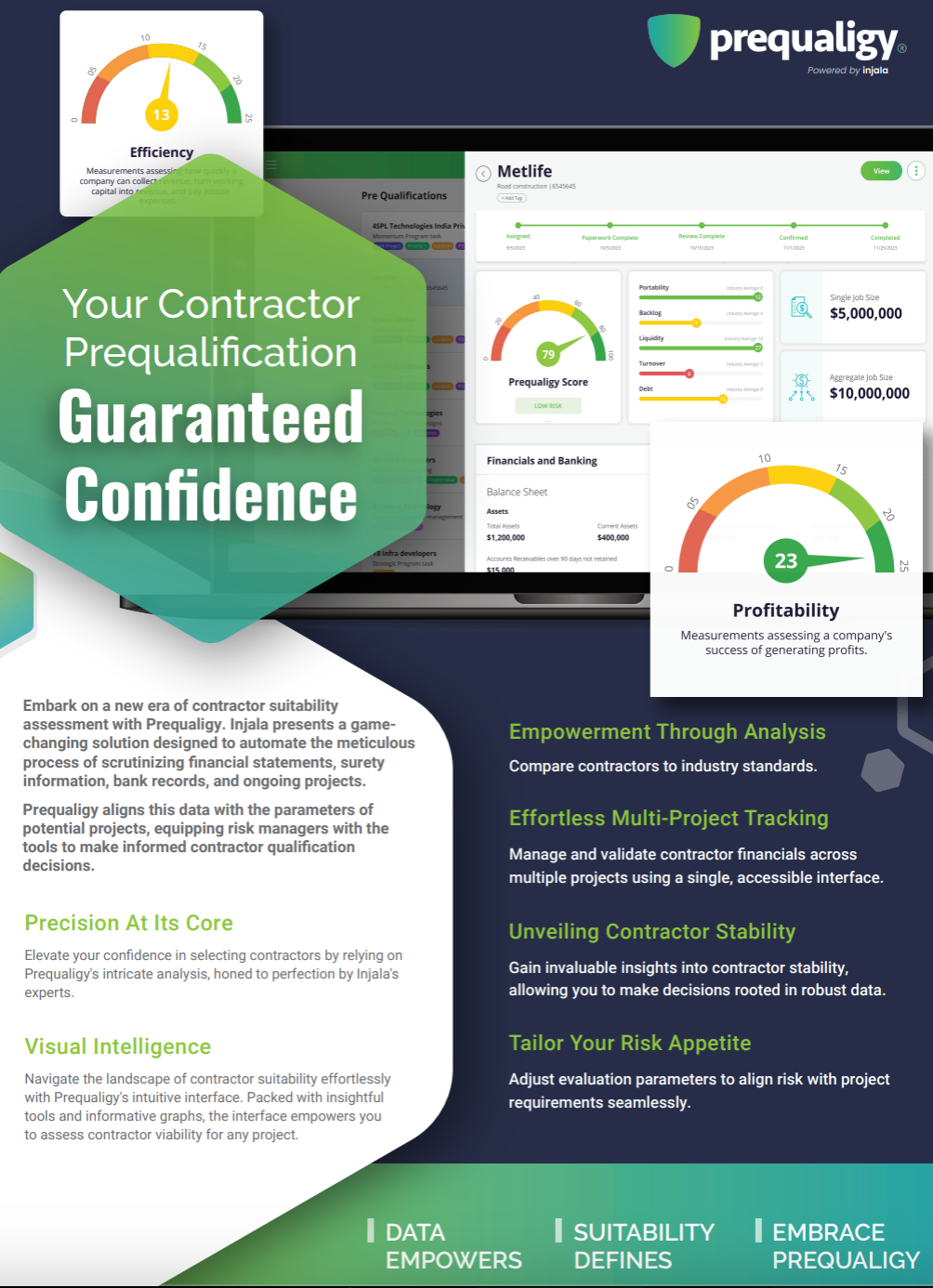 Injala’s Prequaligy™ contractor pre-qualification software automates the process of analyzing financial statements, surety information, bank information, and works-in-progress, and compares that data with the parameters of a prospective project to help risk managers assess a contractor’s qualifications.