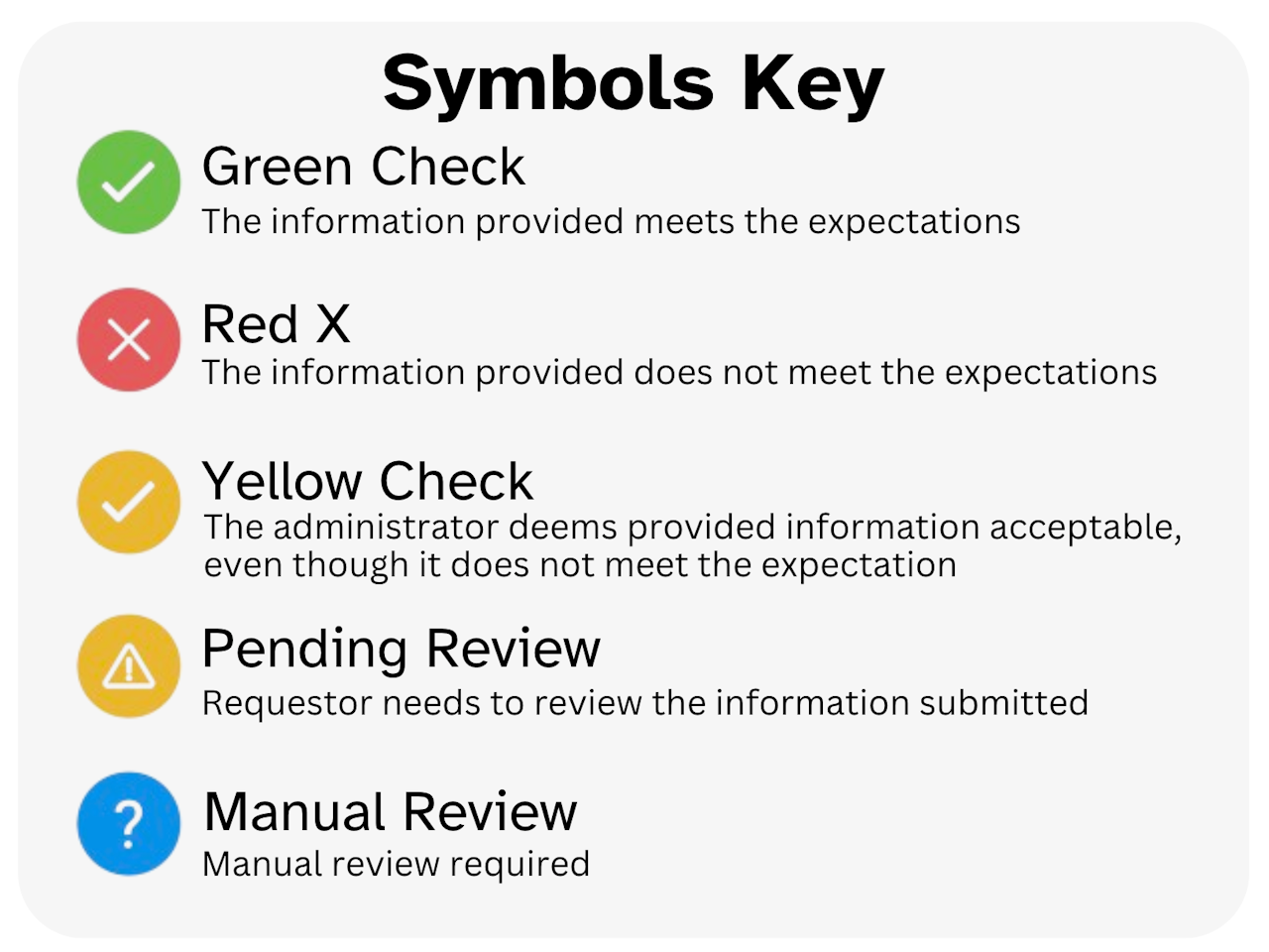 A Blue Question Mark indicates that a manual review is required by the administrator/requestor